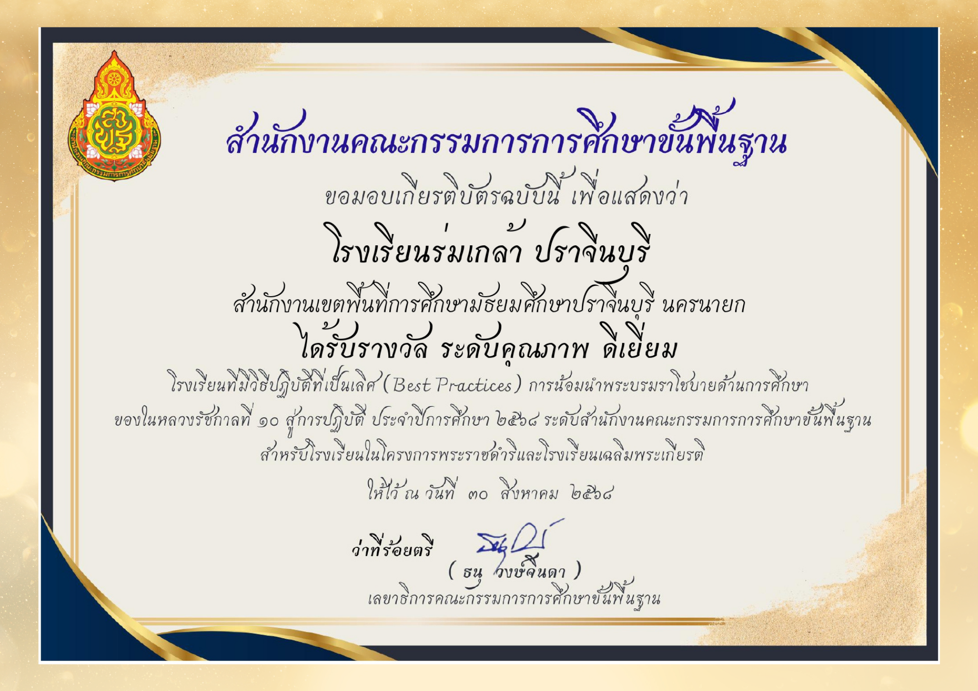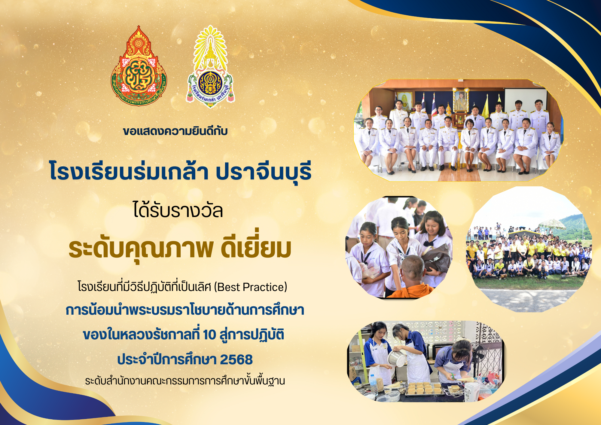 โรงเรียนร่มเกล้า ปราจีนบุรี ได้รับรางวัลระดับคุณภาพ ดีเยี่ยม โรงเรียนที่มีวิธีปฏิบัติที่เป็นเลิศ (Best Practice) การน้อมนำพระบรมราโชบายด้านการศึกษาของในหลวงรัชกาลที่ 10 สู่การปฏิบัติ