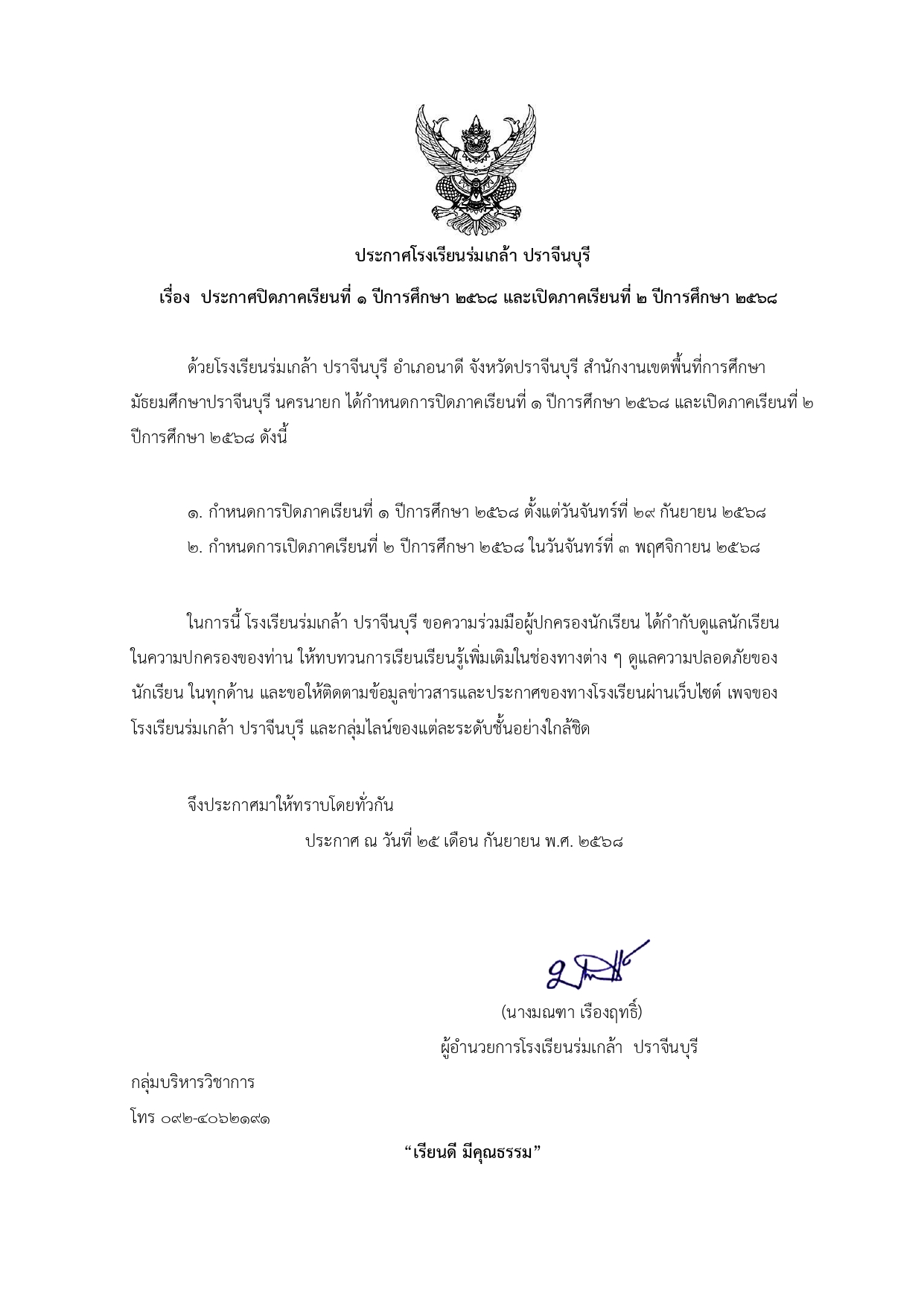 ประกาศโรงเรียนร่มเกล้า ปราจีนบุรี เรื่องการปิดภาคเรียนที่ 1 ปีการศึกษา 2568 และการเปิดภาคเรียนที่ 2 ปีการศึกษา 2568 กันยายน 27, 2025 Kanokwanlai Sonnuch ประกาศ ประกาศโรงเรียนร่มเกล้า ปราจีนบุรี เรื่องการปิดภาคเรียนที่ 1 ปีการศึกษา 2568 และการเปิดภาคเรียนที่ 2 ปีการศึกษา 2568 ประกาศโรงเรียนร่มเกล้า ปราจีนบุรี เรื่องการปิดภาคเรียนที่ 1 ปีการศึกษา 2568 และการเปิดภาคเรียนที่ 2 ปีการศึกษา 2568